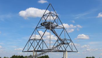 | Die begehbare Aussichtsterrasse in Form einer dreiseitigen Pyramide auf der Halde Beckstraße in Bottrop bietet einen weiten Rundblick über das Ruhrgebiet. Die Halde ist durch ein dichtes Wegenetz erschlossen, kann aber auch auf direkten Weg über eine Treppe mit 387 Stufen erklommen werden. Die Konstruktion besteht aus 210 Tonnen Stahl, auf der sich in verschiedenen Höhen Aussichtsplattformen befinden. Die oberste Plattform befindet sich in einer Höhe von 38 Metern, addiert man die Höhe der Halde von etwa 90 Metern hinzu, bietet sich von dort oben ein spektakulärer Weitblick. |